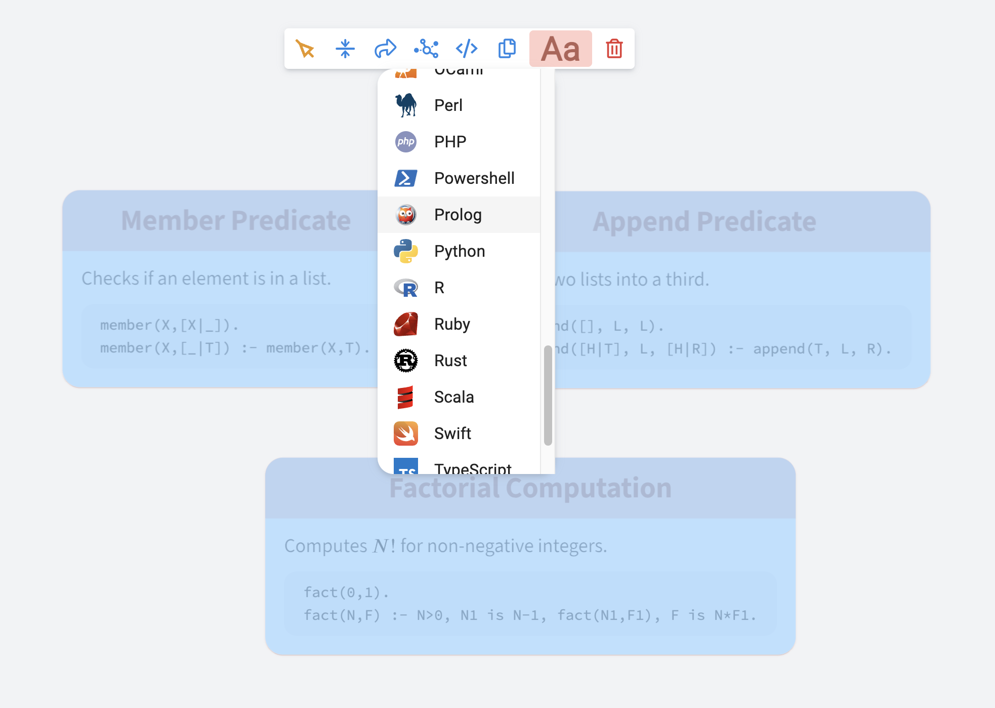 npm startYou can select the programming language for each code block so that syntax highlighting is applied automatically. OrgPad now supports 41 different languages, using the HighlightJS library. We cover everything from the most popular languages to less common functional and configuration ones. We’ve even added support for specialized languages like Lean, Modelica, and LaTeX, which are used in mathematics and science.